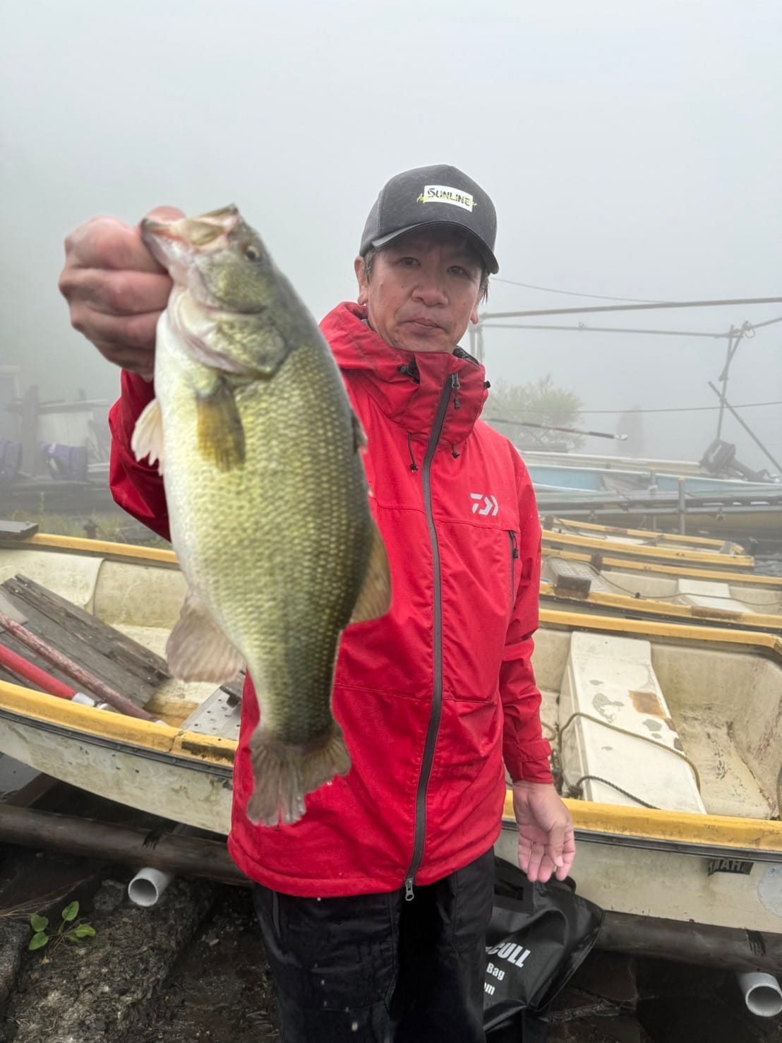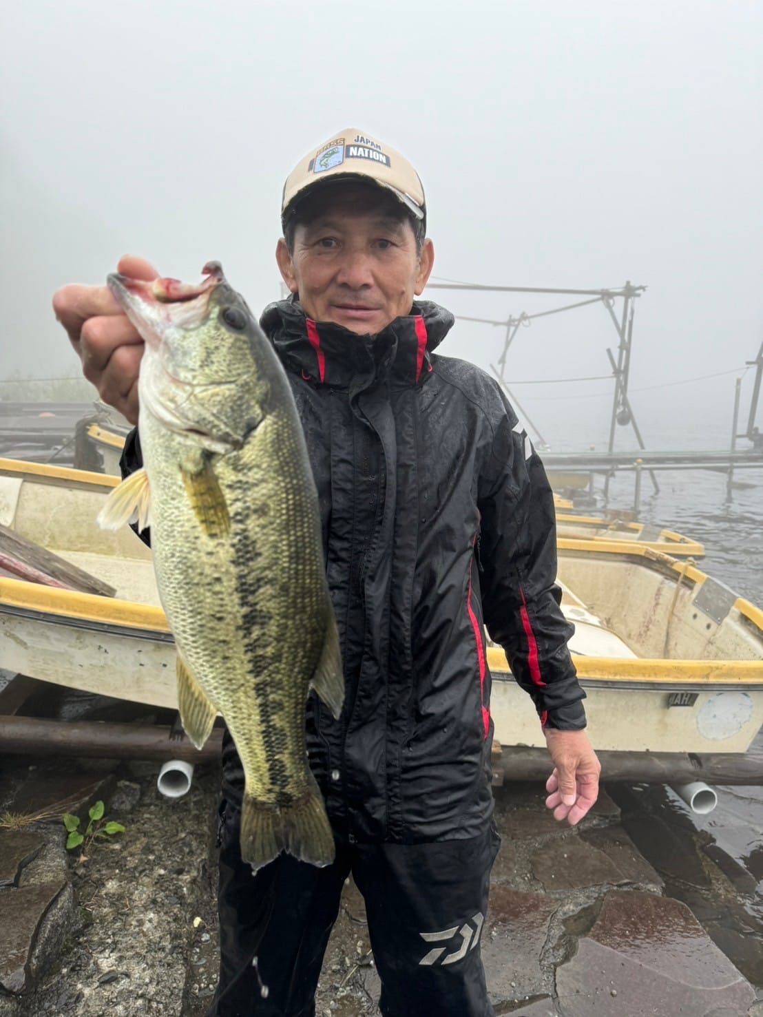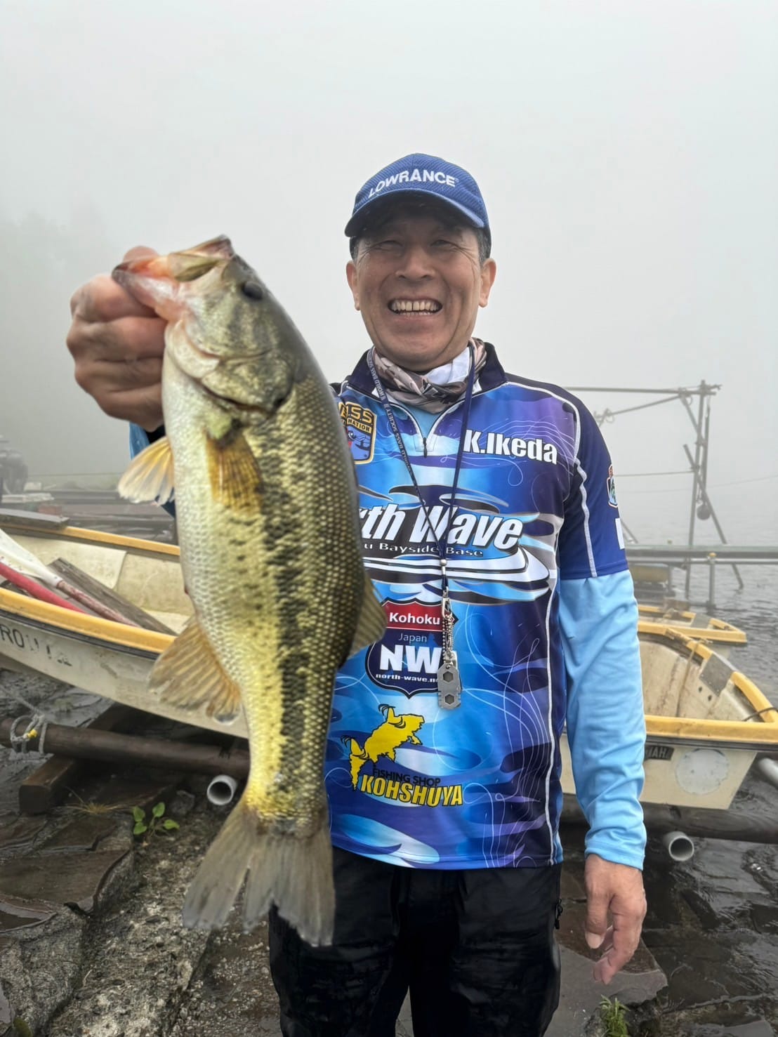 一週間前のプラクティスで湖尻の早川水門沖周りの5~7 m ウィードエリアで良い感触が会ったこと、関田さんの意見を参考に早川水門沖を選びました。当日、トップで連れそうな状況なのでビックバドやロング-Pなどを投げまくりましたが反応がなく、ポークのDSに変更し数投で一匹目が釣れた後あたりがなく少し移動しながら流しました。すると、小さなあたりで良く引くキロアップの2匹目を釣ることができました。数時間後風雨が強くなりボートステイが非常に厳しい状況になりこの場所を断念し、要所要所を流しながら釣り続けましたが釣れず濃霧で周りも見えない状況になったので安全第一を考え、早上がりをしました。
