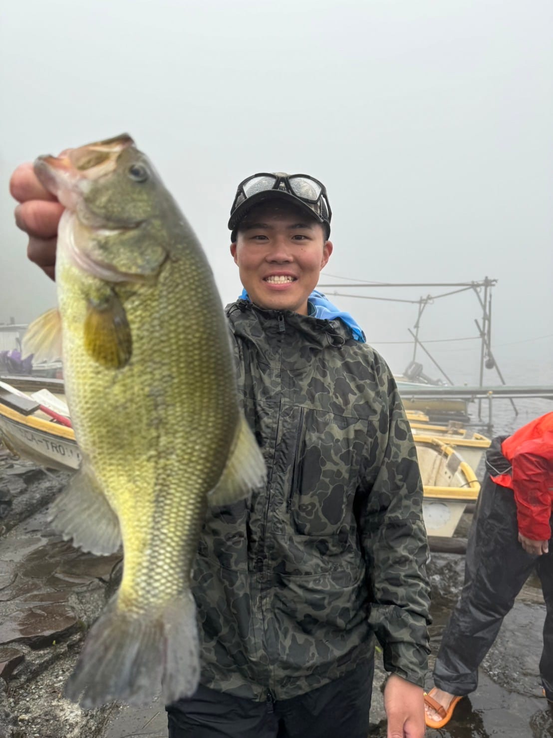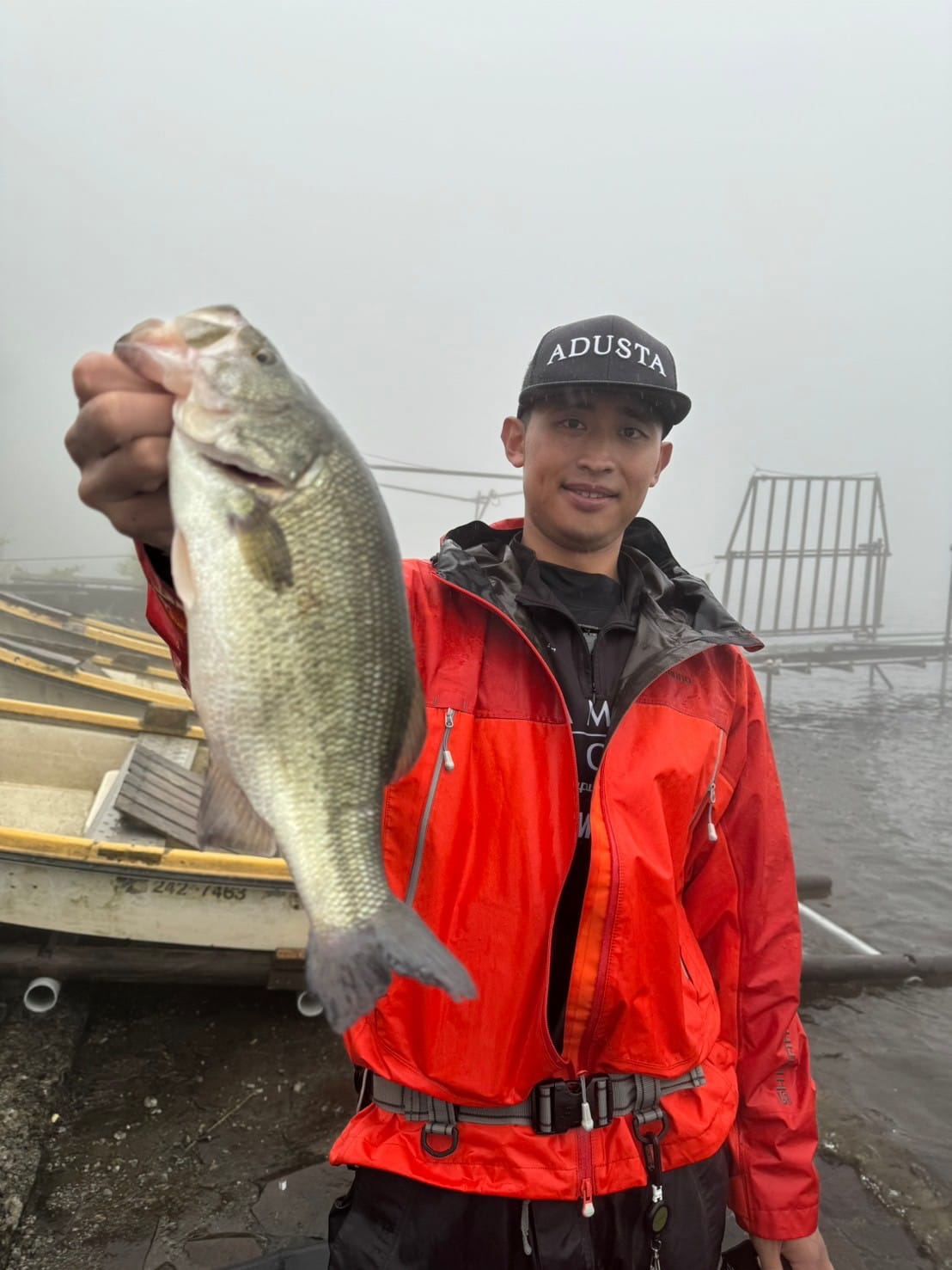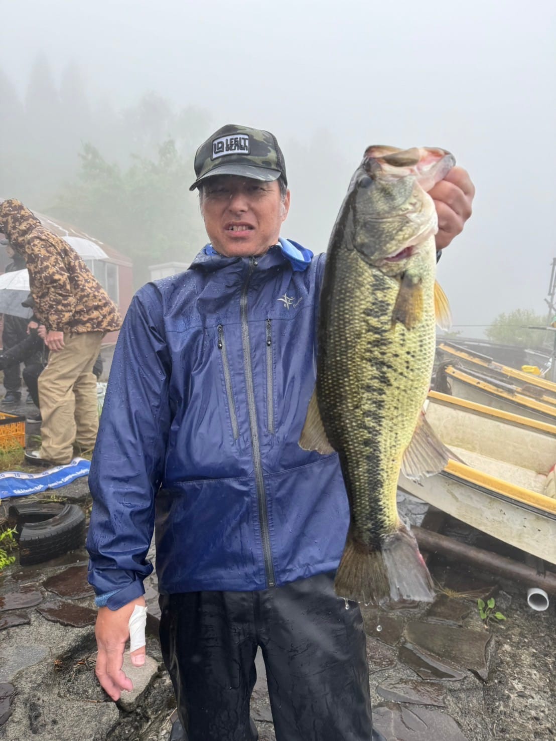 一週間前のプラクティスで湖尻の早川水門沖周りの5~7 m ウィードエリアで良い感触が会ったこと、関田さんの意見を参考に早川水門沖を選びました。当日、トップで連れそうな状況なのでビックバドやロング-Pなどを投げまくりましたが反応がなく、ポークのDSに変更し数投で一匹目が釣れた後あたりがなく少し移動しながら流しました。すると、小さなあたりで良く引くキロアップの2匹目を釣ることができました。数時間後風雨が強くなりボートステイが非常に厳しい状況になりこの場所を断念し、要所要所を流しながら釣り続けましたが釣れず濃霧で周りも見えない状況になったので安全第一を考え、早上がりをしました。