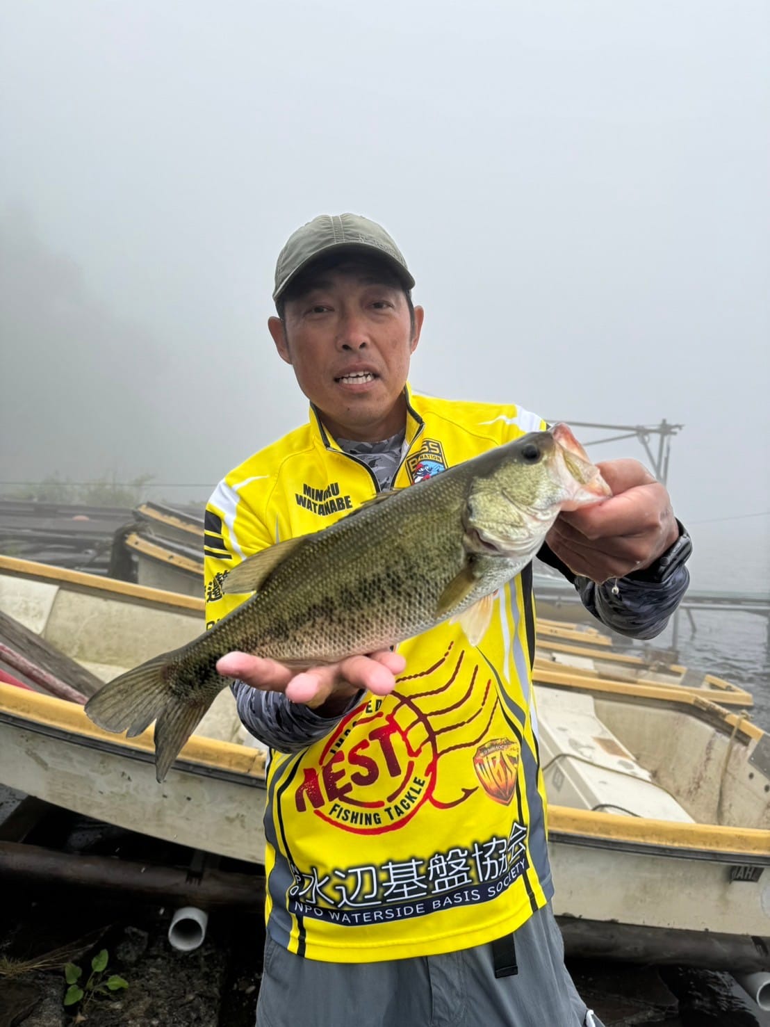 一週間前のプラクティスで湖尻の早川水門沖周りの5~7 m ウィードエリアで良い感触が会ったこと、関田さんの意見を参考に早川水門沖を選びました。当日、トップで連れそうな状況なのでビックバドやロング-Pなどを投げまくりましたが反応がなく、ポークのDSに変更し数投で一匹目が釣れた後あたりがなく少し移動しながら流しました。すると、小さなあたりで良く引くキロアップの2匹目を釣ることができました。数時間後風雨が強くなりボートステイが非常に厳しい状況になりこの場所を断念し、要所要所を流しながら釣り続けましたが釣れず濃霧で周りも見えない状況になったので安全第一を考え、早上がりをしました。