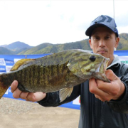 全日にプラを行い、全域をまわりましたが沖のフラットではなかなかバイトが取れず、バンク沿いでは何とか食わすことができる状態でしたが、それでもかなり渋くノーフィッシュもあり得る感じでした。風も強く吹く予報も出ており、更に釣りづらい状況を考えてタックルを組みました。当日の時間短縮、激荒れに濁りの中、最初に入ったポイントではすぐにバイトが取れたので、「何とか釣れるかも」と思いましたが、そこからノーバイト地獄(強風でわからないのかも)でしたが、あきらめかけた終了20分前に待望の一匹が来ました。最後の30分は自分の釣りをしようと、野尻湖で良く使うキャロでの一匹に出会えて救われました。今年初参戦での一年でしたが、色んな人と出会えて初フィールドでの体験と、コアアングラーと言う慣れない中、トーナメント委員を初め皆様に教えていただきありがとうございました。アメリカ行きも手に入れ、これからますますお世話になると思いますが宜しくお願いいたします。