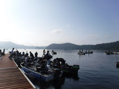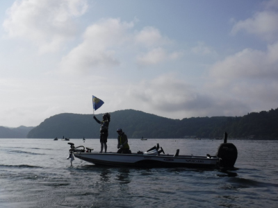 プラは仕事の都合でできなかったんですが、夏の終わりで魚が浮いているのかと思ったら、ボーターの岡田さんはボトムずる引きとのこと。わたし自身もキヤロメインに考えていたのですぐにアジャスト出来ました。スタートして3投目でバイト。私自身フッキングは強めなのでドラグは緩めにしているのにフック折れ。サイズが大きいと判断してドラグをさらに緩めて一匹目。サイズは良い。2匹目を狙うがバイトが小さくティップにかすかに出る程度。飲ませてしまうとデッドになるので即がけでした。大会中7本かけて5本キャッチ。エリアは弁天島の鳥居前のハードボトムの6メートル前後。メインタックルは73のロックフィッシュ用のスピニング。ライン、リーダーは4ポンドのライトキヤロで使ったワームはバークレイのインチホッグのちょんがけ。カラーはグリパン系でした。大会が終わった翌日も釣りをしたんですが、2匹しか釣れず。帰りまぎわにボートの前をワカサギの群れが横切った時、下から40アップのスモールが数匹沸いて出てきたのを見た時、自分には足りない何かを感じた気がしました。又今大会ボーターの岡田さんにはとても感謝します。ありがとうございました。ちなみにあのパターンは合ってたみたいですよ!